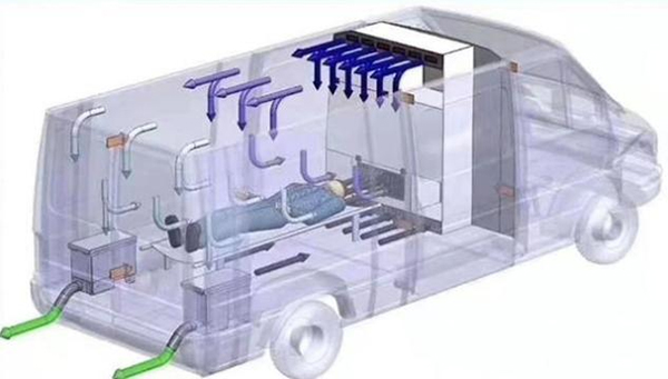 救護(hù)車啟動了負(fù)壓裝置后,系統(tǒng)將對擔(dān)架上患者呼出的空氣進(jìn)行強(qiáng)力抽吸,最終經(jīng)過濾設(shè)備消毒后排出車外,成為無污染空氣。由于車內(nèi)醫(yī)療艙形成了比外部大氣壓低10-30Pa的負(fù)壓,病人呼出的空氣不會從車輛門窗縫隙排出車外,能夠有效防止病毒感染沿途環(huán)境。而進(jìn)入車內(nèi)的新風(fēng)也會進(jìn)行過濾,保證病人不會因外部環(huán)境造成感染。